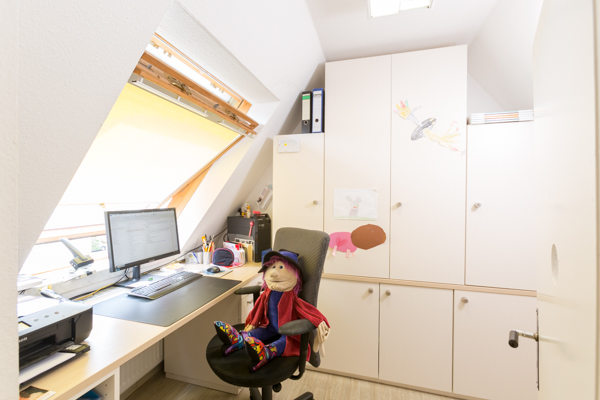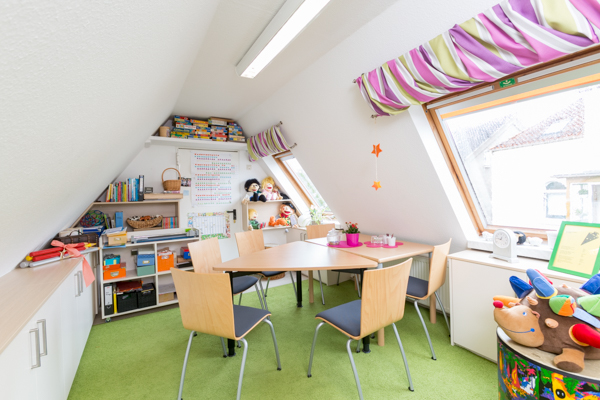 Unterm Dach sind die Erzieherinnen untergebracht. Für die Vorbereitungszeit und Elterngespräche steht ein eigener Aufenthaltsraum zur Verfügung. Ebenso befindet sich unser Büro ganz oben.
