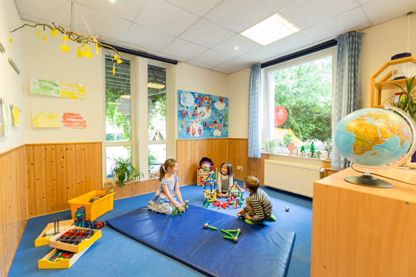Im Erdgeschoß befindet sich der Gruppenraum der Großen. Hier wird in der Puppenecke gekocht oder auf der Kuschelempore entspannt. Auf dem Bauteppich entstehen Gehege für Schleich-Tiere oder die Lego-Eisenbahn dreht dort ihre Runden. Außerdem treffen wir uns hier häufig zum Sitzkreis und lauschen den Erzieherinnen und PraktikantInnen beim Vorlesen.
