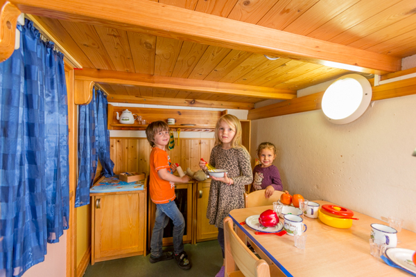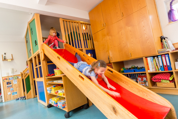 Die erste Etage ist das Reich der Kleinen. Besonders beliebt sind die beiden Rutschen - die Geburtstagsrutsche im Gruppenraum und die Tunnelrutsche von Balkon in den Garten. Eigentlich ist sie für Notfälle gebaut worden, aber manchmal stürmen wir durch das ganze Haus und rutschen, was das Zeug hält.