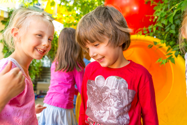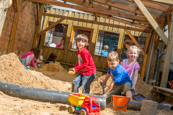 Am liebsten aber spielen unsere Kindergartenkinder im Außenbereich. Der Garten bietet einen überdachten Sandkasten, der uns auch bei Regen trocken buddeln läßt. Der gepflasterte Bereich eignet sich prima zum Laufrad oder Rollerfahren.